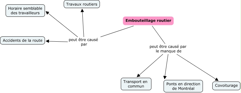 This Concept Map has information related to: Embouteillage routier, Embouteillage routier peut être causé par le manque de Transport en commun, Embouteillage routier peut être causé par le manque de Ponts en direction de Montréal, Embouteillage routier peut être causé par Horaire semblable des travailleurs, Embouteillage routier peut être causé par Accidents de la route, Embouteillage routier peut être causé par Travaux routiers, Embouteillage routier peut être causé par le manque de Covoiturage
