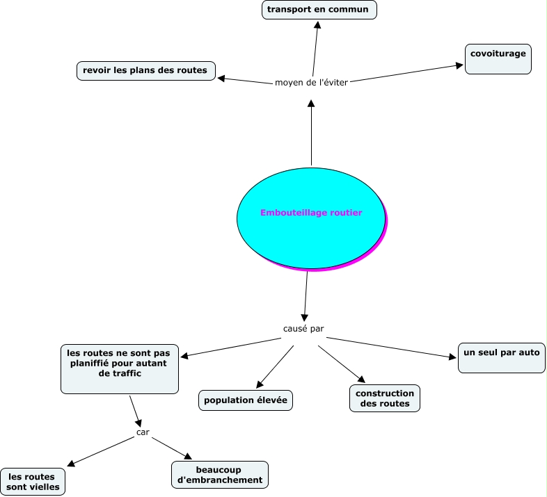 This Concept Map has information related to: embouteillage routier, Embouteillage routier causé par population élevée, Embouteillage routier causé par les routes ne sont pas planiffié pour autant de traffic, Embouteillage routier moyen de l'éviter covoiturage, Embouteillage routier causé par un seul par auto, les routes ne sont pas planiffié pour autant de traffic car beaucoup d'embranchement, Embouteillage routier moyen de l'éviter revoir les plans des routes, Embouteillage routier moyen de l'éviter transport en commun, les routes ne sont pas planiffié pour autant de traffic car les routes sont vielles, Embouteillage routier causé par construction des routes