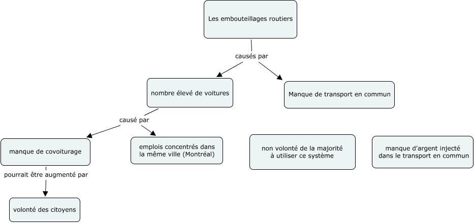 This Concept Map has information related to: embouteillages, Les embouteillages routiers causés par Manque de transport en commun, manque de covoiturage pourrait être augmenté par volonté des citoyens, nombre élevé de voitures causé par emplois concentrés dans la même ville (Montréal), nombre élevé de voitures causé par manque de covoiturage, Les embouteillages routiers causés par nombre élevé de voitures