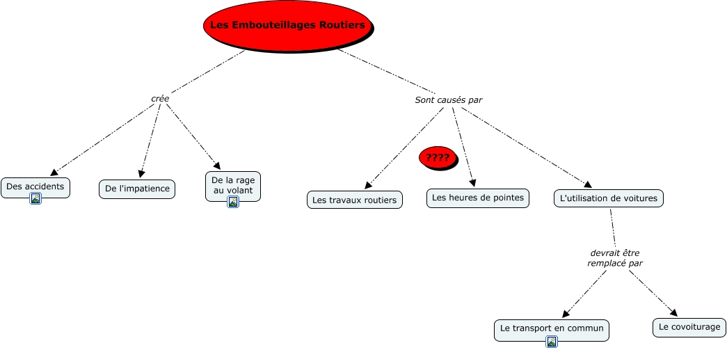 This Concept Map has information related to: embouteillages, Les Embouteillages Routiers Sont causés par L'utilisation de voitures, Les Embouteillages Routiers crée De l'impatience, Les Embouteillages Routiers Sont causés par Les travaux routiers, Les Embouteillages Routiers Sont causés par Les heures de pointes, Les Embouteillages Routiers crée Des accidents, Les Embouteillages Routiers crée De la rage au volant, L'utilisation de voitures devrait être remplacé par Le covoiturage, L'utilisation de voitures devrait être remplacé par Le transport en commun
