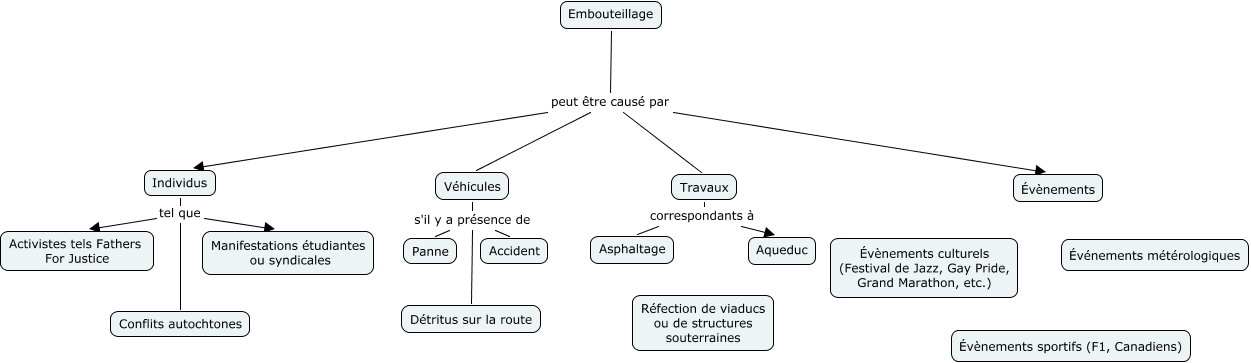 This Concept Map has information related to: Lanoue et Lefebvre, Véhicules s'il y a présence de Détritus sur la route, Embouteillage peut être causé par Individus, Individus tel que Conflits autochtones, Individus tel que Activistes tels Fathers For Justice, Embouteillage peut être causé par Évènements, Individus tel que Manifestations étudiantes ou syndicales, Travaux correspondants à Asphaltage, Embouteillage peut être causé par Travaux, Véhicules s'il y a présence de Accident, Embouteillage peut être causé par Véhicules
