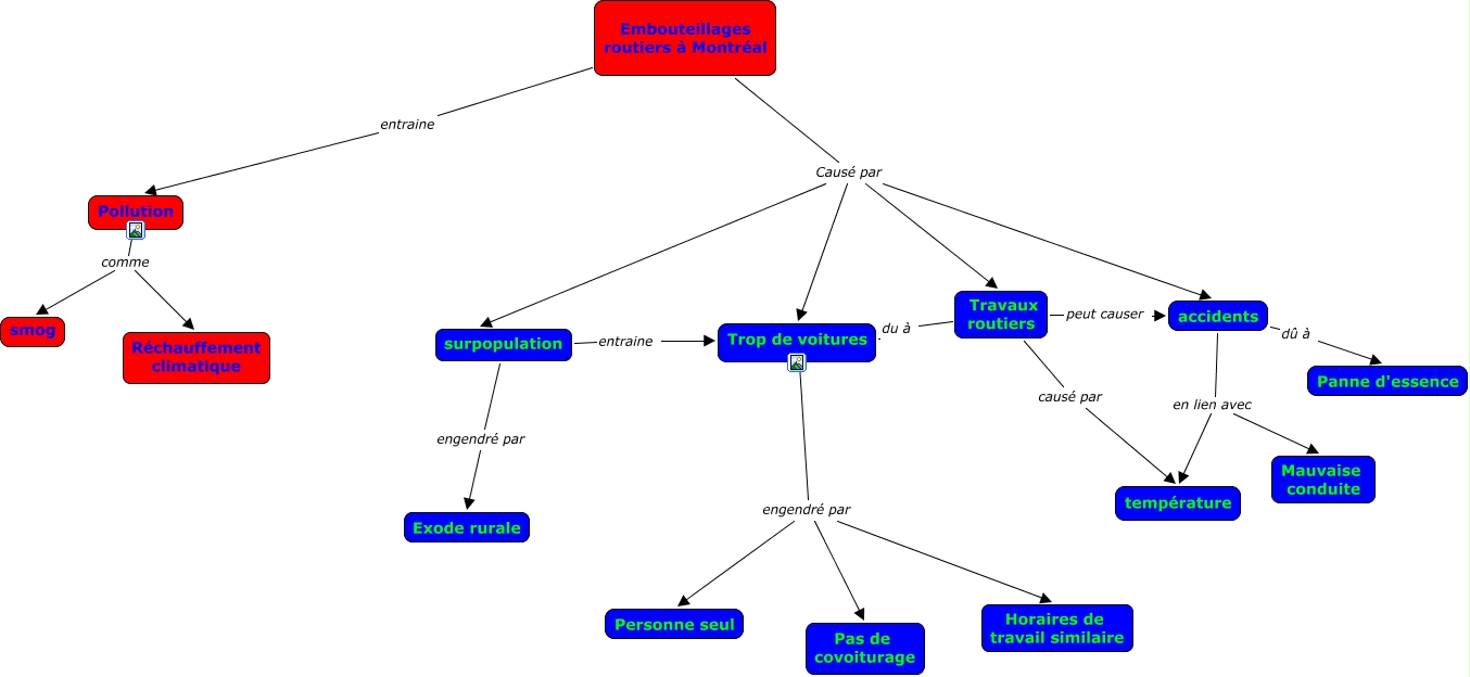 This Concept Map has information related to: sauvons la planète, Embouteillages routiers à Montréal Causé par Trop de voitures, Trop de voitures engendré par Horaires de travail similaire, Embouteillages routiers à Montréal entraine Pollution, surpopulation entraine Trop de voitures, Embouteillages routiers à Montréal Causé par accidents, Pollution comme Réchauffement climatique, Travaux routiers peut causer accidents, Travaux routiers causé par température, accidents dû à Panne d'essence, Embouteillages routiers à Montréal Causé par surpopulation