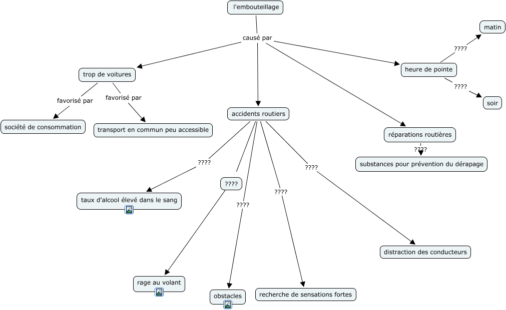 This Concept Map has information related to: embouteille - esquisse, accidents routiers ???? taux d'alcool élevé dans le sang, accidents routiers ???? distraction des conducteurs, trop de voitures favorisé par société de consommation, accidents routiers rage au volant, l'embouteillage causé par heure de pointe, l'embouteillage causé par réparations routières, réparations routières ???? substances pour prévention du dérapage, accidents routiers ???? obstacles, l'embouteillage causé par accidents routiers, heure de pointe ???? matin