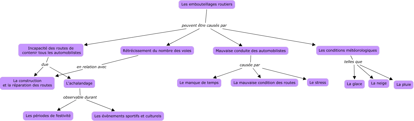 This Concept Map has information related to: Les embouteillages routiers- VV, Les embouteillages routiers peuvent être causés par Incapacité des routes de contenir tous les automobilistes, Incapacité des routes de contenir tous les automobilistes due La construction et la réparation des routes, Les embouteillages routiers peuvent être causés par Les conditions météorologiques, Mauvaise conduite des automobilistes causée par Le manque de temps, Les embouteillages routiers peuvent être causés par Rétrécissement du nombre des voies, Incapacité des routes de contenir tous les automobilistes due L'achalandage, Mauvaise conduite des automobilistes causée par La mauvaise condition des routes, Les embouteillages routiers peuvent être causés par Mauvaise conduite des automobilistes, L'achalandage observable durant Les périodes de festivité, Les conditions météorologiques telles que La pluie