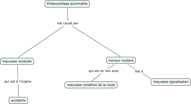 This Concept Map has information related to: Map 2, travaux routiers liés à mauvaise signalisation, Embouteillage automobile est causé par mauvaise conduite, mauvaise conduite qui est à l'origine accidents, Embouteillage automobile est causé par travaux routiers, travaux routiers qui est en lien avec mauvaise condition de la route