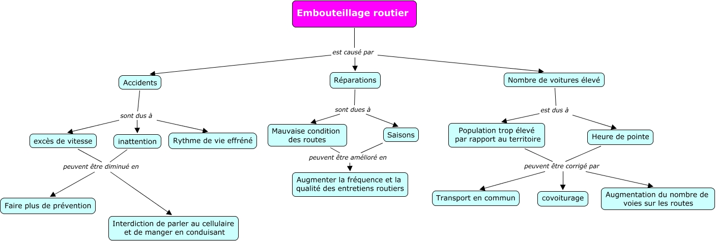 This Concept Map has information related to: p0864955, Accidents sont dus à Rythme de vie effréné, Accidents sont dus à inattention, Population trop élevé par rapport au territoire peuvent être corrigé par Augmentation du nombre de voies sur les routes, Accidents sont dus à excès de vitesse, Embouteillage routier est causé par Réparations, Nombre de voitures élevé est dus à Population trop élevé par rapport au territoire, Mauvaise condition des routes peuvent être amélioré en Augmenter la fréquence et la qualité des entretiens routiers, Embouteillage routier est causé par Nombre de voitures élevé, Population trop élevé par rapport au territoire peuvent être corrigé par Transport en commun, inattention peuvent être diminué en Faire plus de prévention