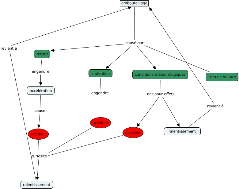 This Concept Map has information related to: embouteillage, trop de voiture causé par retard, embouteillage causé par conditions météorologiques, ralentissement revient à embouteillage, embouteillage causé par inatention, conditions météorologiques ont pour effets accident, accident curiosité ralentissement, retard engendre accélération, trop de voiture causé par conditions météorologiques, accélération cause accident, accident curiosité ralentissement