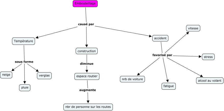 This Concept Map has information related to: embouteillage, Embouteillage causé par accident, Température sous forme pluie, espace routier augmente nbr de personne sur les routes, construction diminue espace routier, accident favorisé par fatigue, Embouteillage causé par construction, accident favorisé par stress, Température sous forme verglas, accident favorisé par alcool au volant, accident favorisé par vitesse
