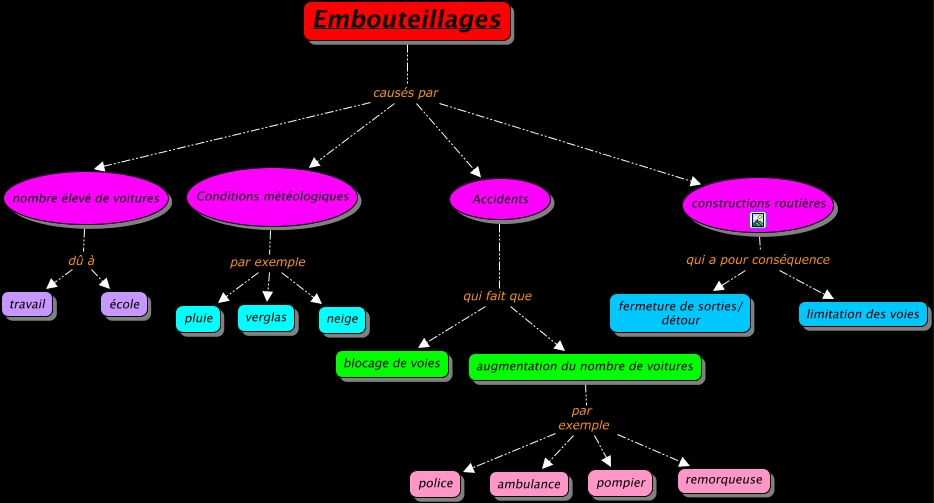 This Concept Map has information related to: Embouteillage-Christine N, augmentation du nombre de voitures par exemple ambulance, augmentation du nombre de voitures par exemple pompier, augmentation du nombre de voitures par exemple remorqueuse, Embouteillages causés par nombre élevé de voitures, Embouteillages causés par Accidents, augmentation du nombre de voitures par exemple police, Accidents qui fait que blocage de voies, Conditions météologiques par exemple neige, Embouteillages causés par Conditions météologiques, nombre élevé de voitures dû à école