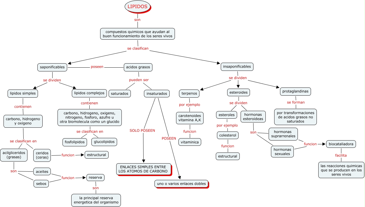 Este Cmap, tiene información relacionada con: lipidos, insaturados POSEEN uno o varios enlaces dobles, compuestos quimicos que ayudan al buen funcionamiento de los seres vivos se clasifican insaponificables, hormonas esteroideas son hormonas sexuales, sebos funcion reserva, insaturados SOLO POSEEN ENLACES SIMPLES ENTRE LOS ATOMOS DE CARBONO, acidos grasos pueden ser insaturados, acidos grasos pueden ser saturados, carbono, hidrogeno y oxigeno se clasifican en acilgliceridos (grasas), hormonas sexuales funcion biocataliadora, insaponificables se dividen protaglandinas, lipidos simples contienen carbono, hidrogeno y oxigeno, colesterol funcion estructural, carbono, hidrogeno, oxigeno, nitrogeno, fosforo, azufre u otra biomolecula como un glucido se clasifican en fosfolipidos, esteroides se dividen hormonas esteroideas, biocataliadora facilita las reacciones quimicas que se producen en los seres vivos, carbono, hidrogeno, oxigeno, nitrogeno, fosforo, azufre u otra biomolecula como un glucido se clasifican en glucolipidos, insaponificables se dividen terpenos, terpenos por ejemplo carotenoides vitamina A,K, hormonas esteroideas son hormonas suprarrenales, carotenoides vitamina A,K funcion vitaminica