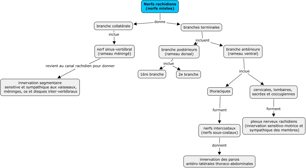This Concept Map has information related to: nerfs rachidiens, branche postérieure (rameau dorsal) inclue 2e branche, nerfs intercostaux (nerfs sous-costaux) donnent innervation des parois antéro-latérales thoraco-abdominales, branches terminales incluent branche antérieure (rameau ventral), branche postérieure (rameau dorsal) inclue 1ère branche, branche antérieure (rameau ventral) inclue thoraciques, thoraciques forment nerfs intercostaux (nerfs sous-costaux), branche collatérale inclue nerf sinus-vertébral (rameau méningé), Nerfs rachidiens (nerfs mixtes) donne branche collatérale, cervicales, lombaires, sacrées et coccygiennes forment plexus nerveux rachidiens (innervation sensitivo-motrice et sympathique des membres), branches terminales incluent branche postérieure (rameau dorsal)