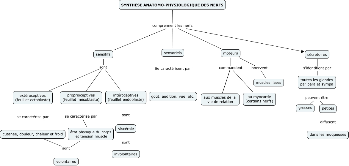 This Concept Map has information related to: Synthèse anatamo-physiologique des nerfs, proprioceptives (feuillet mésoblaste) se caractérise par état physique du corps et tension muscle, viscérale sont involontaires, moteurs commandent au myocarde (certains nerfs), toutes les glandes par para et sympa peuvent être petites, sensoriels Se caractérisent par goût, audition, vue, etc., sensitifs sont intéroceptives (feuillet endoblaste), sensitifs sont extéroceptives (feuillet ectoblaste), SYNTHÈSE ANATOMO-PHYSIOLOGIQUE DES NERFS comprennent les nerfs sensitifs, aux muscles de la vie de relation commandent au myocarde (certains nerfs), sensitifs sont proprioceptives (feuillet mésoblaste)