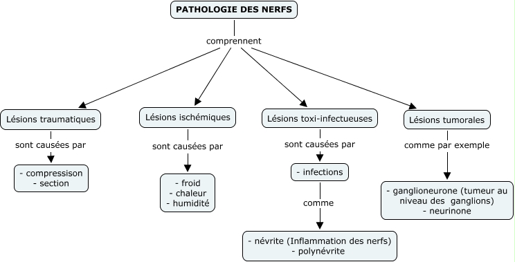 This Concept Map has information related to: Pathologie des nerfs, Lésions tumorales comme par exemple - ganglioneurone (tumeur au niveau des ganglions) - neurinone, Lésions toxi-infectueuses sont causées par - infections, PATHOLOGIE DES NERFS comprennent Lésions tumorales, Lésions traumatiques sont causées par - compressison - section, PATHOLOGIE DES NERFS comprennent Lésions toxi-infectueuses, PATHOLOGIE DES NERFS comprennent Lésions ischémiques, PATHOLOGIE DES NERFS comprennent Lésions traumatiques, - infections comme - névrite (Inflammation des nerfs) - polynévrite, Lésions ischémiques sont causées par - froid - chaleur - humidité