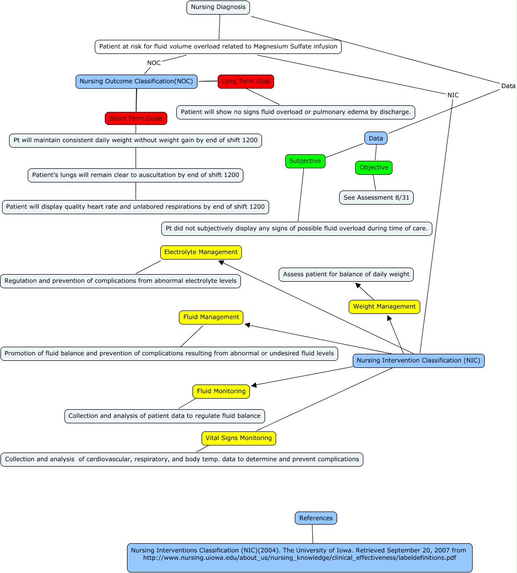 This Concept Map has information related to: Mark Kolich Care Plan, Nursing Diagnosis Data Data, Nursing Diagnosis ???? Patient at risk for fluid volume overload related to Magnesium Sulfate infusion, Nursing Intervention Classification (NIC) ???? Electrolyte Management, Nursing Intervention Classification (NIC) ???? Weight Management, Objective ???? See Assessment 8/31, Nursing Intervention Classification (NIC) ???? Fluid Monitoring, Nursing Outcome Classification(NOC) ???? Patient will show no signs fluid overload or pulmonary edema by discharge., Electrolyte Management ???? Regulation and prevention of complications from abnormal electrolyte levels, Nursing Outcome Classification(NOC) ???? Pt will maintain consistent daily weight without weight gain by end of shift 1200, Nursing Outcome Classification(NOC) ???? Patient will show no signs fluid overload or pulmonary edema by discharge.