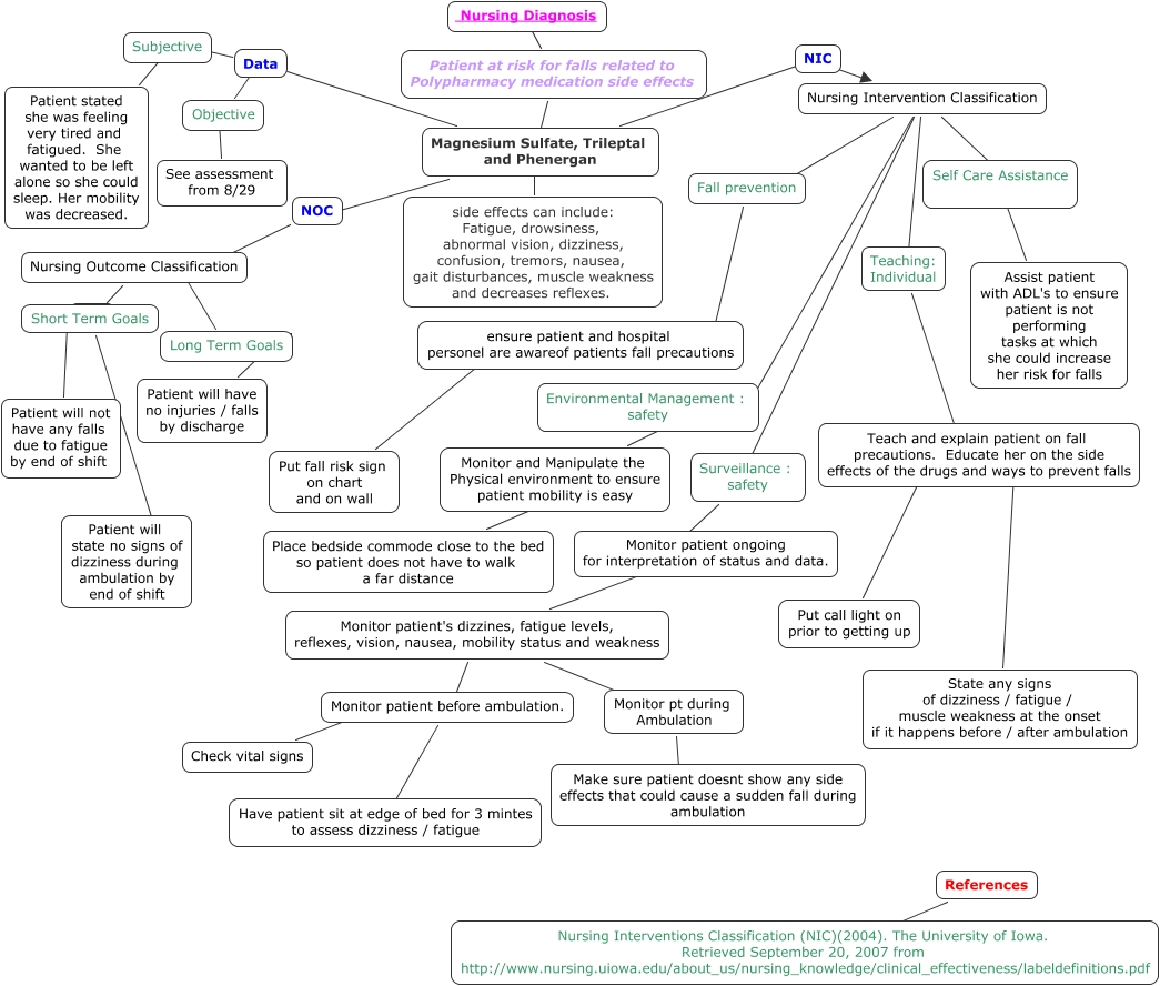 This Concept Map has information related to: Lyndsey Kytta care plan, Short Term Goals ???? Patient will not have any falls due to fatigue by end of shift, Monitor and Manipulate the Physical environment to ensure patient mobility is easy ???? Place bedside commode close to the bed so patient does not have to walk a far distance, Data ???? Subjective, ensure patient and hospital personel are awareof patients fall precautions ???? Put fall risk sign on chart and on wall, References ???? Nursing Interventions Classification (NIC)(2004). The University of Iowa. Retrieved September 20, 2007 from http://www.nursing.uiowa.edu/about_us/nursing_knowledge/clinical_effectiveness/labeldefinitions.pdf, Nursing Intervention Classification ???? Surveillance : safety, Teach and explain patient on fall precautions. Educate her on the side effects of the drugs and ways to prevent falls ???? Put call light on prior to getting up, Monitor patient ongoing for interpretation of status and data. ???? Monitor patient's dizzines, fatigue levels, reflexes, vision, nausea, mobility status and weakness, Nursing Intervention Classification ???? Self Care Assistance, Magnesium Sulfate, Trileptal and Phenergan ???? NOC