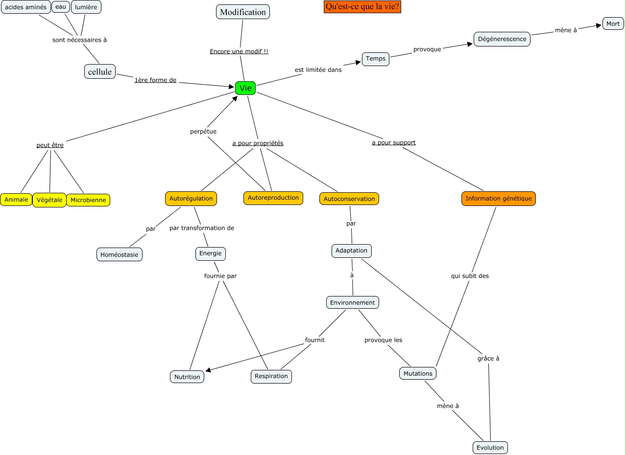This Concept Map has information related to: viemat, Mutations mène à Evolution, Vie peut être Animale, Environnement fournit Respiration, Vie a pour support Information génétique, Modification Encore une modif !! Vie, Autoconservation par Adaptation, Environnement fournit Nutrition, Adaptation à Environnement, Vie a pour propriétés Autorégulation, Vie a pour propriétés Autoconservation