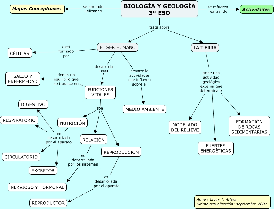 ESO3, EL SER HUMANO desarrolla actividades que influyen sobre el MEDIO AMBIENTE, BIOLOGÍA Y GEOLOGÍA 3º ESO se aprende utilizando Mapas Conceptuales, REPRODUCCIÓN es desarrollada por el aparato REPRODUCTOR, NUTRICIÓN es desarrollada por el aparato EXCRETOR, BIOLOGÍA Y GEOLOGÍA 3º ESO se refuerza realizando Actividades, BIOLOGÍA Y GEOLOGÍA 3º ESO trata sobre LA TIERRA, LA TIERRA tiene una actividad geológica externa que determina el MODELADO DEL RELIEVE, BIOLOGÍA Y GEOLOGÍA 3º ESO trata sobre EL SER HUMANO, LA TIERRA tiene una actividad geológica externa que determina el FORMACIÓN DE ROCAS SEDIMENTARIAS, FUNCIONES VITALES son RELACIÓN