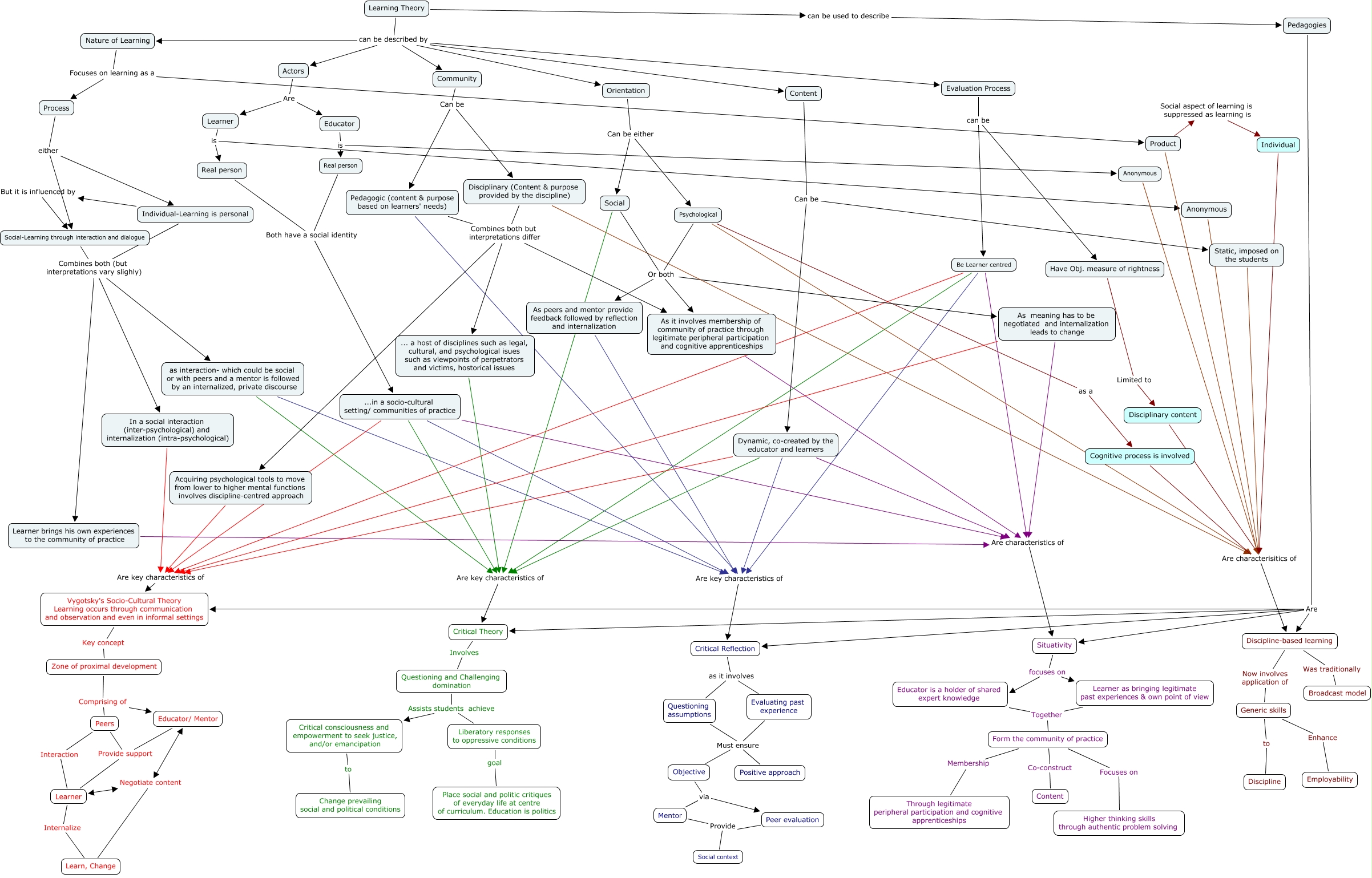 This Concept Map has information related to: Milind Cmap Final, Individual-Learning is personal Combines both (but interpretations vary slighly) Learner brings his own experiences to the community of practice, Questioning and Challenging domination Assists students achieve Critical consciousness and empowerment to seek justice, and/or emancipation, Dynamic, co-created by the educator and learners Are characteristics of Situativity, Psychological Are characterisitics of Discipline-based learning, Individual-Learning is personal Combines both (but interpretations vary slighly) In a social interaction (inter-psychological) and internalization (intra-psychological), Questioning assumptions Must ensure Objective, Form the community of practice Focuses on Higher thinking skills through authentic problem solving, Real person Both have a social identity ...in a socio-cultural setting/ communities of practice, Situativity focuses on Learner as bringing legitimate past experiences & own point of view, Community Can be Disciplinary (Content & purpose provided by the discipline)