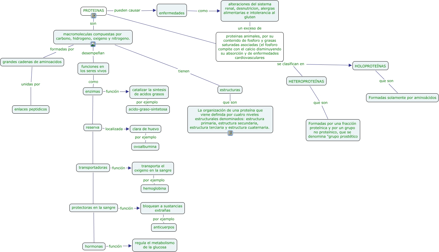Esse mapa conceitual, produzido no IHMC CmapTools, tem a informação relacionada a: proteinas, catalizar la sintesis de acidos grasos por ejemplo acido-graso-sintetosa, estructuras que son La organización de una proteína que viene definida por cuatro niveles estructurales denominados: estructura primaria, estructura secundaria, estructura terciaria y estructura cuaternaria., reserva localizada clara de huevo, PROTEINAS son macromoleculas compuestas por carbono, hidrogeno, oxigeno y nitrogeno., macromoleculas compuestas por carbono, hidrogeno, oxigeno y nitrogeno. desempeñan funciones en los seres vivos, hormonas función regula el metabolismo de la glucosa, reserva ???? transportadoras, alteraciones del sistema renal, desnutricion, alergias alimentarias e intolerancia al gluten un exceso de proteinas animales, por su contenido de fosforo y grasas saturadas asociadas (el fosforo compite con el calcio disminuyendo su absorción y de enfermedades cardiovasculares, HETEROPROTEÍNAS que son Formadas por una fracción proteínica y por un grupo no proteínico, que se denomina "grupo prostético, PROTEINAS se clasifican en HOLOPROTEÍNAS, enzimas función catalizar la sintesis de acidos grasos, bloquean a sustancias extrañas por ejemplo anticuerpos, protectoras en la sangre función bloquean a sustancias extrañas, enzimas ???? reserva, HOLOPROTEÍNAS que son Formadas solamente por aminoácidos, grandes cadenas de aminoacidos unidas por enlaces peptidicos, macromoleculas compuestas por carbono, hidrogeno, oxigeno y nitrogeno. formadas por grandes cadenas de aminoacidos, enfermedades como alteraciones del sistema renal, desnutricion, alergias alimentarias e intolerancia al gluten, PROTEINAS se clasifican en HETEROPROTEÍNAS, macromoleculas compuestas por carbono, hidrogeno, oxigeno y nitrogeno. tienen estructuras