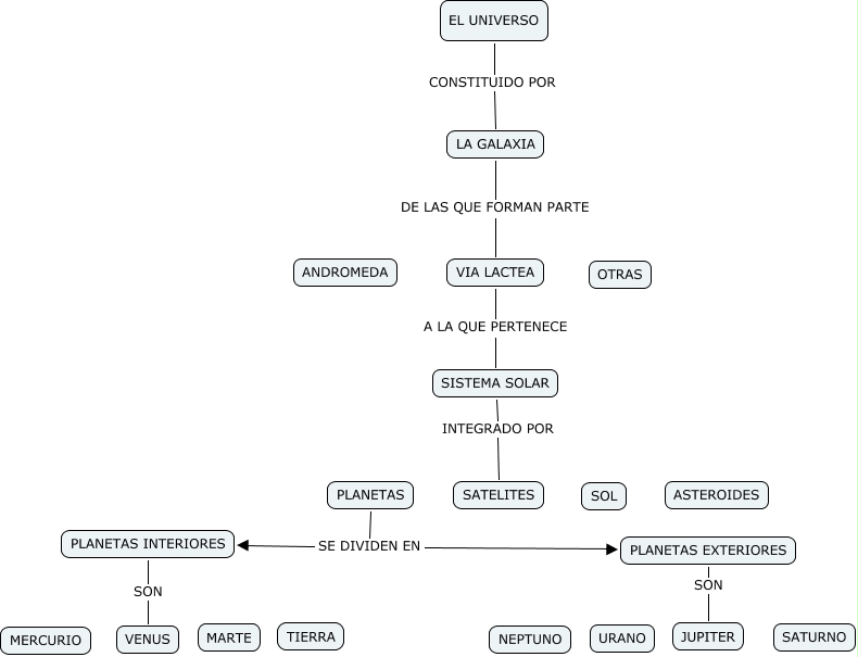 Este mapa conceptual tiene información relacionada a: C.S. EL UNIVERSO, PLANETAS SE DIVIDEN EN PLANETAS INTERIORES, LA GALAXIA DE LAS QUE FORMAN PARTE VIA LACTEA, EL UNIVERSO CONSTITUIDO POR LA GALAXIA, SISTEMA SOLAR INTEGRADO POR SATELITES, VIA LACTEA A LA QUE PERTENECE SISTEMA SOLAR, PLANETAS INTERIORES SON VENUS, PLANETAS SE DIVIDEN EN PLANETAS EXTERIORES, PLANETAS EXTERIORES SON JUPITER