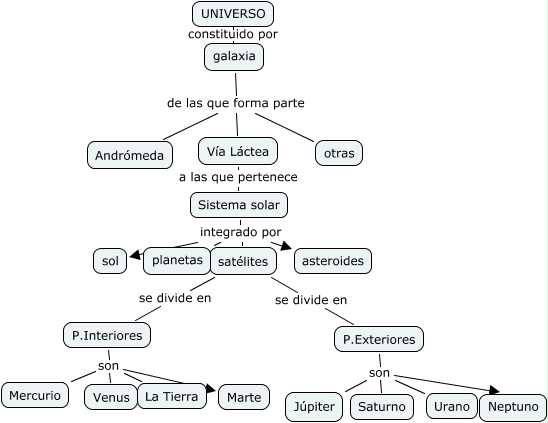 Este mapa conceptual tiene información relacionada a: mapa conceptual del sistema solar, galaxia de las que forma parte otras, Sistema solar integrado por sol, P.Interiores son Venus, P.Exteriores son Saturno, P.Exteriores son Urano, P.Exteriores son Júpiter, UNIVERSO constituido por galaxia, P.Interiores son La Tierra, P.Exteriores son Neptuno, Sistema solar integrado por asteroides