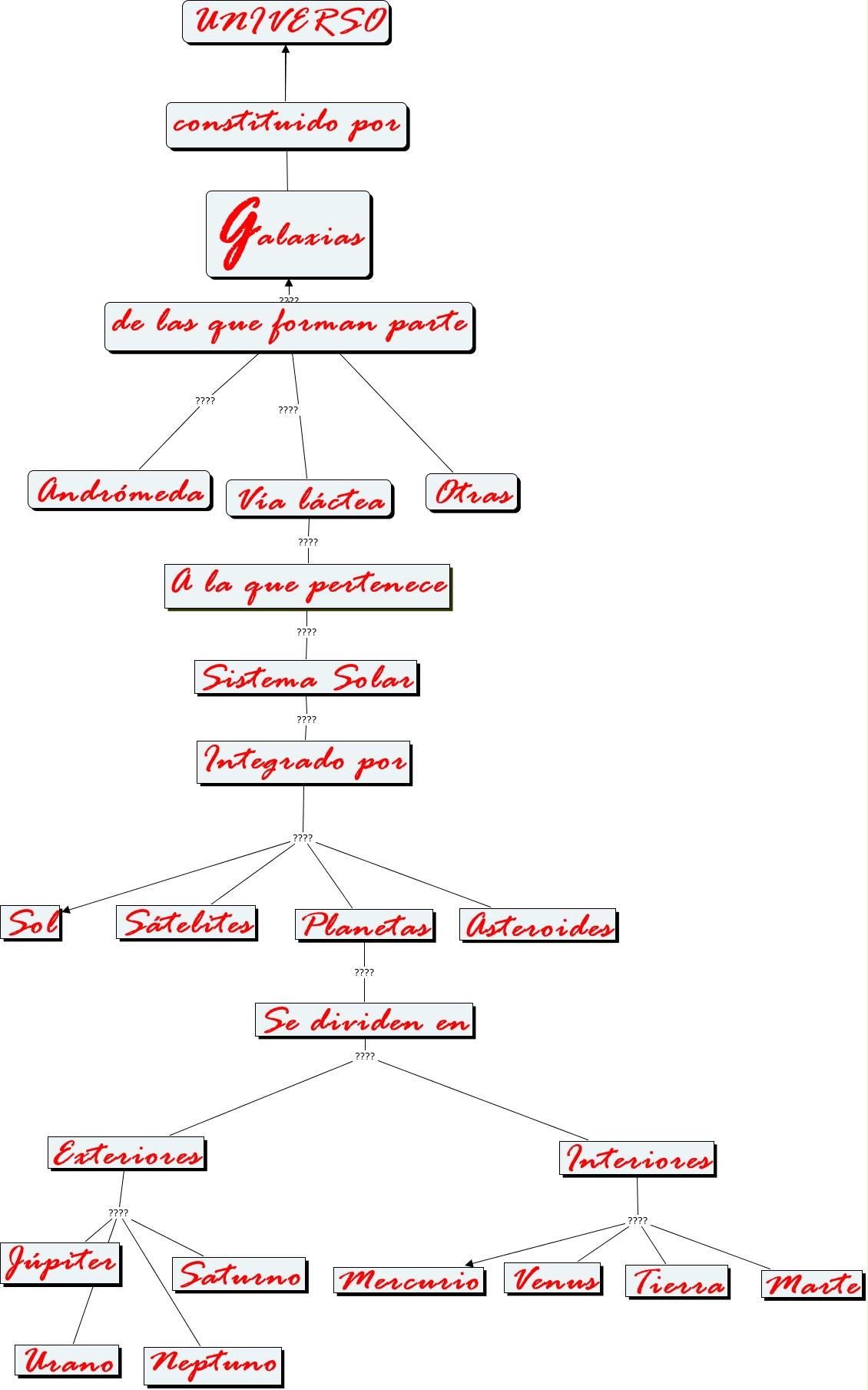 Este mapa conceptual tiene información relacionada a: Esquema, Interiores ???? Marte, Se dividen en ???? Exteriores, constituido por ???? Galaxias, de las que forman parte ???? Andrómeda, Planetas ???? Se dividen en, Integrado por ???? Asteroides, Integrado por ???? Sátelites, Interiores ???? Tierra, Exteriores ???? Saturno, Exteriores ???? Neptuno