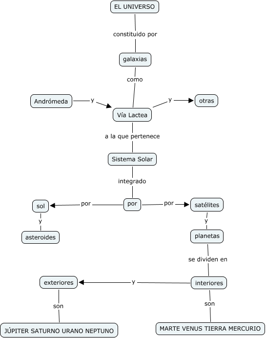Este mapa conceptual tiene información relacionada a: UD1 ANDRES DE ARCOS, Vía Lactea y otras, Sistema Solar integrado por, interiores son MARTE VENUS TIERRA MERCURIO, exteriores son JÚPITER SATURNO URANO NEPTUNO, Andrómeda y Vía Lactea, satélites y planetas, interiores y exteriores, galaxias como Vía Lactea, EL UNIVERSO constituido por galaxias, Vía Lactea a la que pertenece Sistema Solar