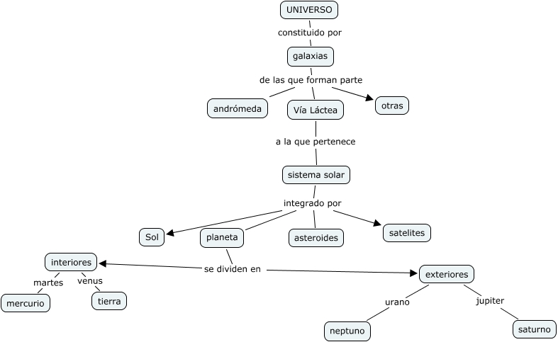 Este mapa conceptual tiene información relacionada a: ud1beatriz jordan de la torre, UNIVERSO constituido por galaxias, sistema solar integrado por planeta, interiores martes mercurio, galaxias de las que forman parte andrómeda, planeta se dividen en exteriores, sistema solar integrado por Sol, sistema solar integrado por satelites, galaxias de las que forman parte otras, interiores venus tierra, exteriores urano neptuno
