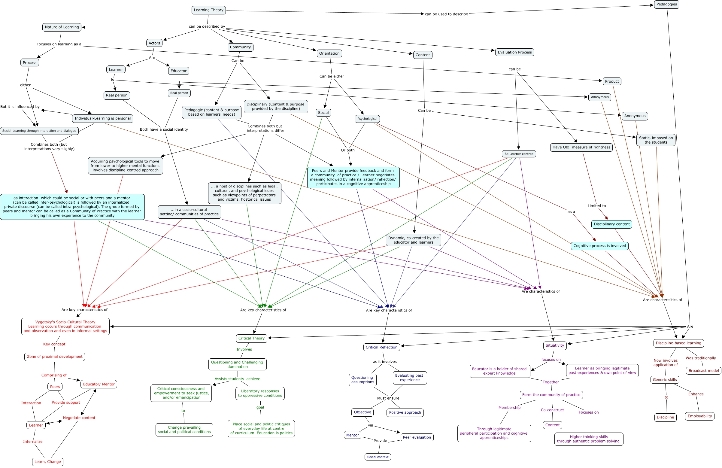 This Concept Map has information related to: Milind Cmap Final V2 (Under test), Learner Internalize Learn, Change, Situativity focuses on Learner as bringing legitimate past experiences & own point of view, Critical Reflection as it involves Questioning assumptions, Pedagogies Are Critical Theory, Have Obj. measure of rightness Limited to Disciplinary content, Evaluation Process can be Be Learner centred, Zone of proximal development Comprising of Educator/ Mentor, Critical Reflection as it involves Evaluating past experience, Peers Interaction Learner, Be Learner centred Are key characteristics of Critical Reflection