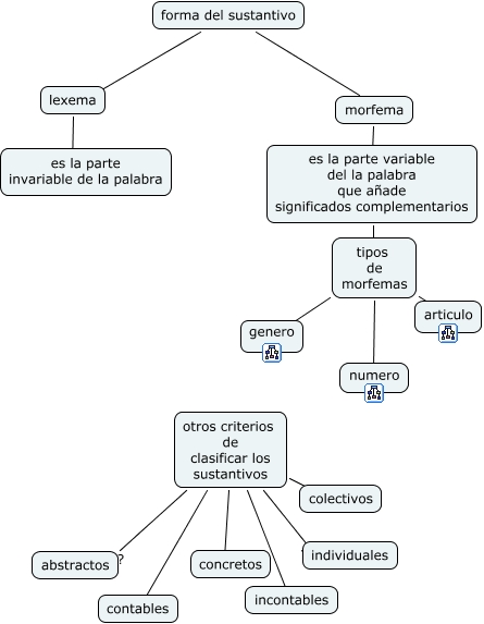 Este mapa conceptual tiene información relacionada a: forma del sustantivo, tipos de morfemas ???? genero, forma del sustantivo ???? morfema, otros criterios de clasificar los sustantivos ???? individuales, es la parte variable del la palabra que añade significados complementarios ???? tipos de morfemas, lexema ???? es la parte invariable de la palabra, otros criterios de clasificar los sustantivos ???? colectivos, otros criterios de clasificar los sustantivos ???? contables, otros criterios de clasificar los sustantivos ???? incontables, morfema ???? es la parte variable del la palabra que añade significados complementarios, forma del sustantivo ???? lexema