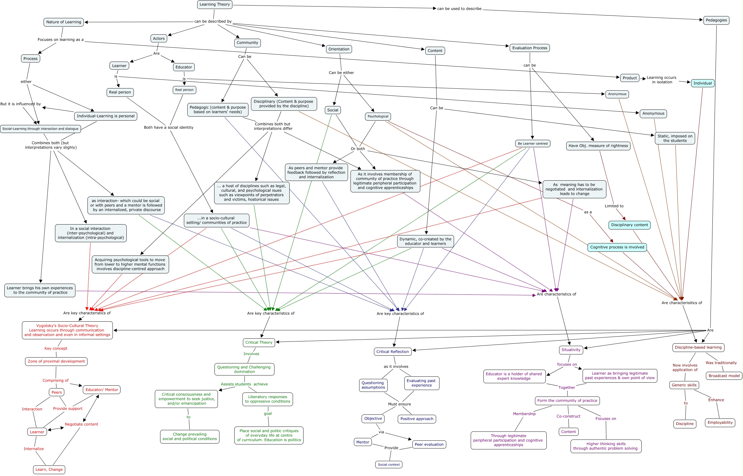 This Concept Map has information related to: Milind Cmap Final (Change made to DBL), Individual-Learning is personal Combines both (but interpretations vary slighly) Learner brings his own experiences to the community of practice, Questioning and Challenging domination Assists students achieve Critical consciousness and empowerment to seek justice, and/or emancipation, Dynamic, co-created by the educator and learners Are characteristics of Situativity, Psychological Are characterisitics of Discipline-based learning, Individual-Learning is personal Combines both (but interpretations vary slighly) In a social interaction (inter-psychological) and internalization (intra-psychological), Questioning assumptions Must ensure Objective, Form the community of practice Focuses on Higher thinking skills through authentic problem solving, Real person Both have a social identity ...in a socio-cultural setting/ communities of practice, Situativity focuses on Learner as bringing legitimate past experiences & own point of view, Community Can be Disciplinary (Content & purpose provided by the discipline)