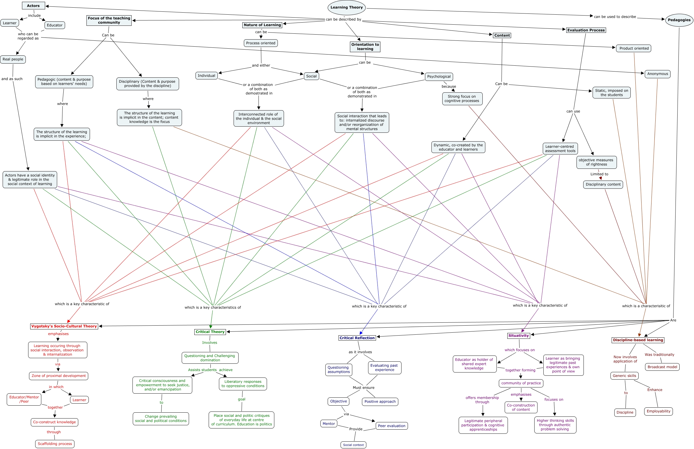 This Concept Map has information related to: Milind_Cmap_Final_LisaUpdates, Content Can be Static, imposed on the students, Learner-centred assessment tools which is a key characteristic of Situativity, Questioning assumptions Must ensure Objective, Learning Theory can be described by Orientation to learning, Product oriented which is a characterisitic of Discipline-based learning, Social interaction that leads to: internalized discourse and/or reorganizatiion of mental structures which is a key characteristic of Vygotsky's Socio-Cultural Theory, The structure of the learning is implicit in the experience; which is a key characteristics of Critical Theory, Educator who can be regarded as Anonymous, Learning occuring through social interaction, observation & internalization via Zone of proximal development, Interconnected role of the individual & the social environment which is a key characteristics of Critical Theory