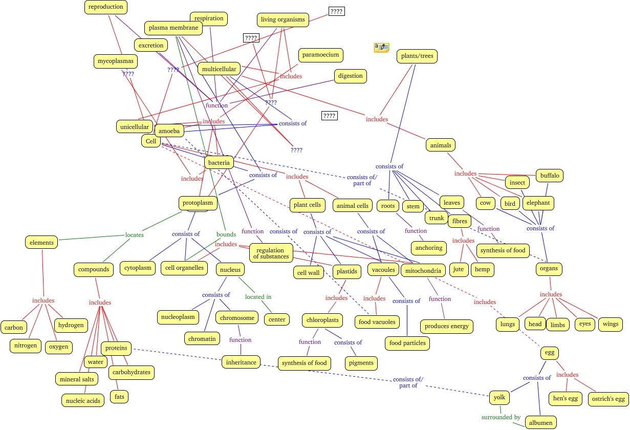 This Concept Map has information related to: Cell Structure and Function-collaboration-s1, organs includes limbs, bird consists of organs, vacoules consists of food particles, cell organelles includes plastids, Cell ???? ????, elements includes nitrogen, plants/trees consists of leaves, vacoules includes food vacuoles, leaves function synthesis of food, fibres includes jute