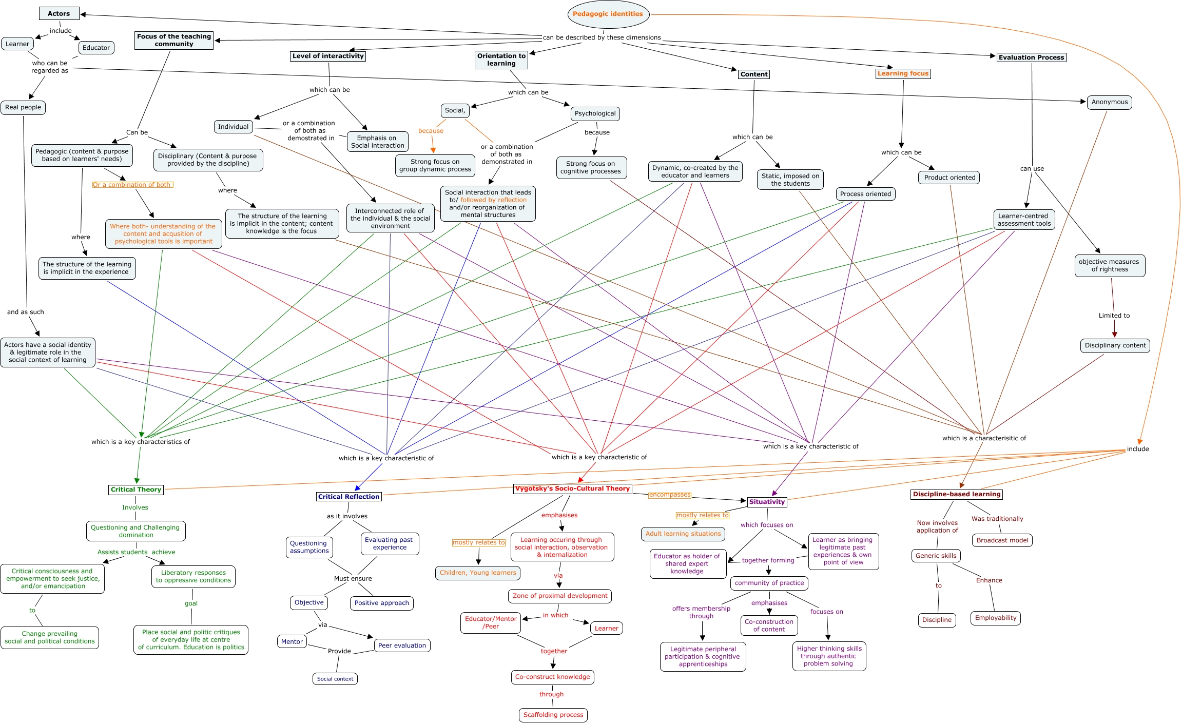 This Concept Map has information related to: Suggestions to Lisa's Final Map In Orange with Milind's updates saved by jeannie, Content which can be Static, imposed on the students, Questioning assumptions Must ensure Objective, Learner-centred assessment tools which is a key characteristic of Situativity, Individual which is a characterisitic of Discipline-based learning, Pedagogic identities can be described by these dimensions Orientation to learning, Pedagogic identities include Vygotsky's Socio-Cultural Theory, Product oriented which is a characterisitic of Discipline-based learning, Educator who can be regarded as Anonymous, Social interaction that leads to/ followed by reflection and/or reorganization of mental structures which is a key characteristic of Vygotsky's Socio-Cultural Theory, Interconnected role of the individual & the social environment which is a key characteristics of Critical Theory
