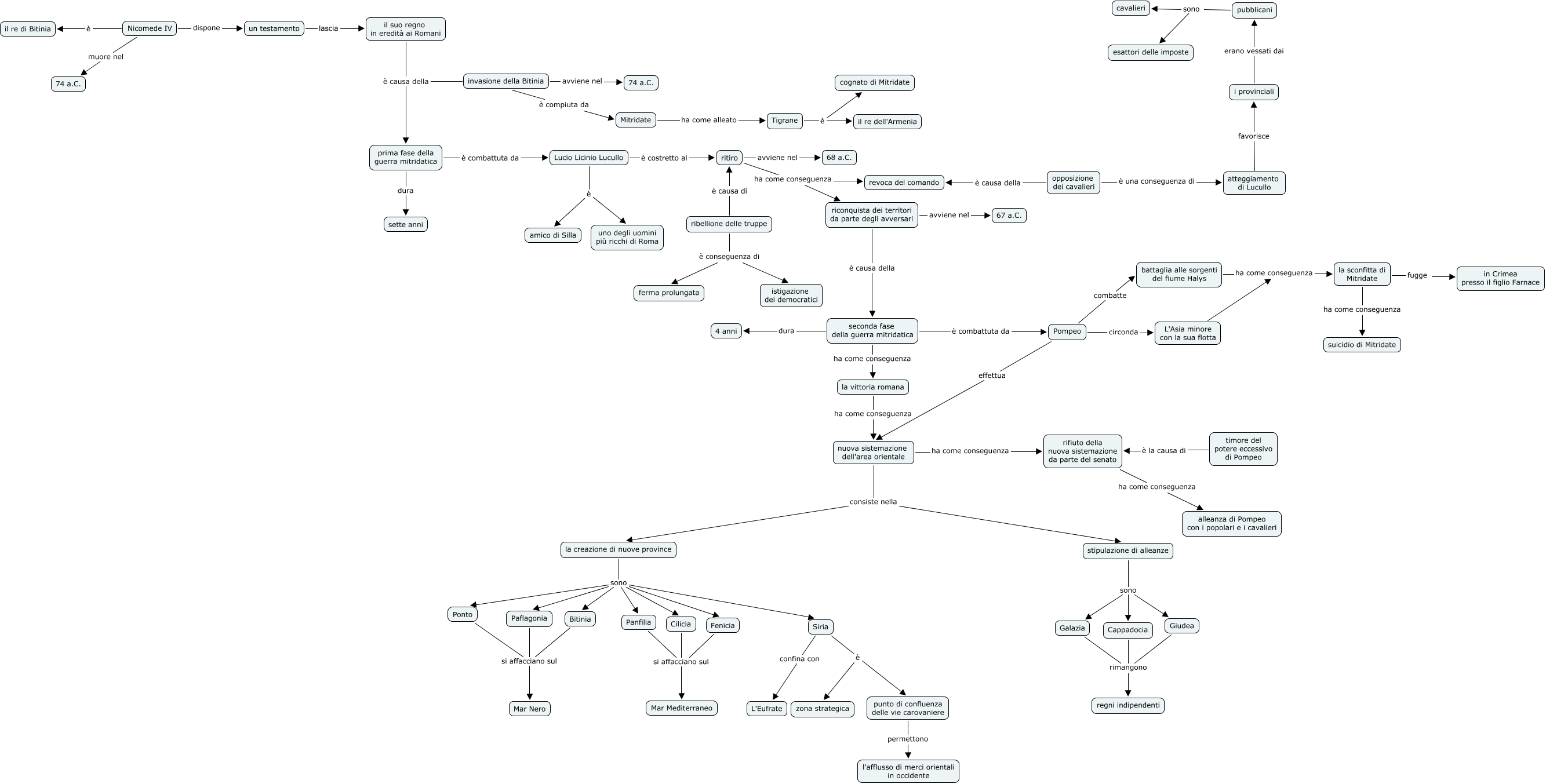 Questa Cmap, creata con IHMC CmapTools, contiene informazioni relative a: Guerra mitridatica, Siria è punto di confluenza delle vie carovaniere, seconda fase della guerra mitridatica dura 4 anni, Pompeo circonda L'Asia minore con la sua flotta, la creazione di nuove province sono Bitinia, Paflagonia si affacciano sul Mar Nero, la sconfitta di Mitridate ha come conseguenza suicidio di Mitridate, pubblicani sono cavalieri, stipulazione di alleanze sono Galazia, battaglia alle sorgenti del fiume Halys ha come conseguenza la sconfitta di Mitridate, prima fase della guerra mitridatica dura sette anni, Fenicia si affacciano sul Mar Mediterraneo, ritiro ha come conseguenza riconquista dei territori da parte degli avversari, nuova sistemazione dell'area orientale consiste nella stipulazione di alleanze, atteggiamento di Lucullo favorisce i provinciali, Tigrane è cognato di Mitridate, opposizione dei cavalieri è causa della revoca del comando, prima fase della guerra mitridatica è combattuta da Lucio Licinio Lucullo, punto di confluenza delle vie carovaniere permettono l'afflusso di merci orientali in occidente, Lucio Licinio Lucullo è uno degli uomini più ricchi di Roma, Bitinia si affacciano sul Mar Nero
