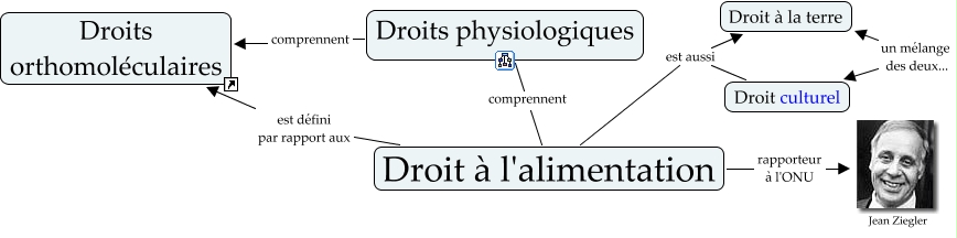 This Concept Map has information related to: Droit à l'alimentation, Droit à l'alimentation est aussi Droit à la terre, Droit à l'alimentation est aussi Droit culturel, Droits physiologiques comprennent Droit à l'alimentation, Droit à l'alimentation rapporteur à l'ONU Jean Ziegler, Droits physiologiques comprennent Droits orthomoléculaires, Droit à l'alimentation est défini par rapport aux Droits orthomoléculaires