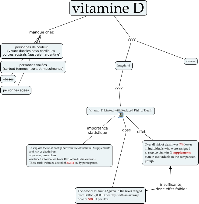 This Concept Map has information related to: vitamine D, vitamine D manque chez personnes âgées, The dose of vitamin D given in the trials ranged from 300 to 2,000 IU per day, with an average dose of 528 IU per day. insuffisante, donc effet faible: Overall risk of death was 7% lower in individuals who were assigned to receive vitamin D supplements than in individuals in the comparison group., Vitamin D Linked with Reduced Risk of Death dose The dose of vitamin D given in the trials ranged from 300 to 2,000 IU per day, with an average dose of 528 IU per day., vitamine D ???? longévité, Vitamin D Linked with Reduced Risk of Death importance statistique To explore the relationship between use of vitamin D supplements and risk of death from any cause, researchers combined information from 18 vitamin D clinical trials. These trials included a total of 57,311 study participants., vitamine D ???? cancer, vitamine D manque chez personnes de couleur (vivant dansles pays nordiques ou très australs (australei, argentine), longévité ???? Vitamin D Linked with Reduced Risk of Death, Vitamin D Linked with Reduced Risk of Death effet Overall risk of death was 7% lower in individuals who were assigned to receive vitamin D supplements than in individuals in the comparison group., vitamine D manque chez personnes voilées (surtout femmes, surtout musulmanes)