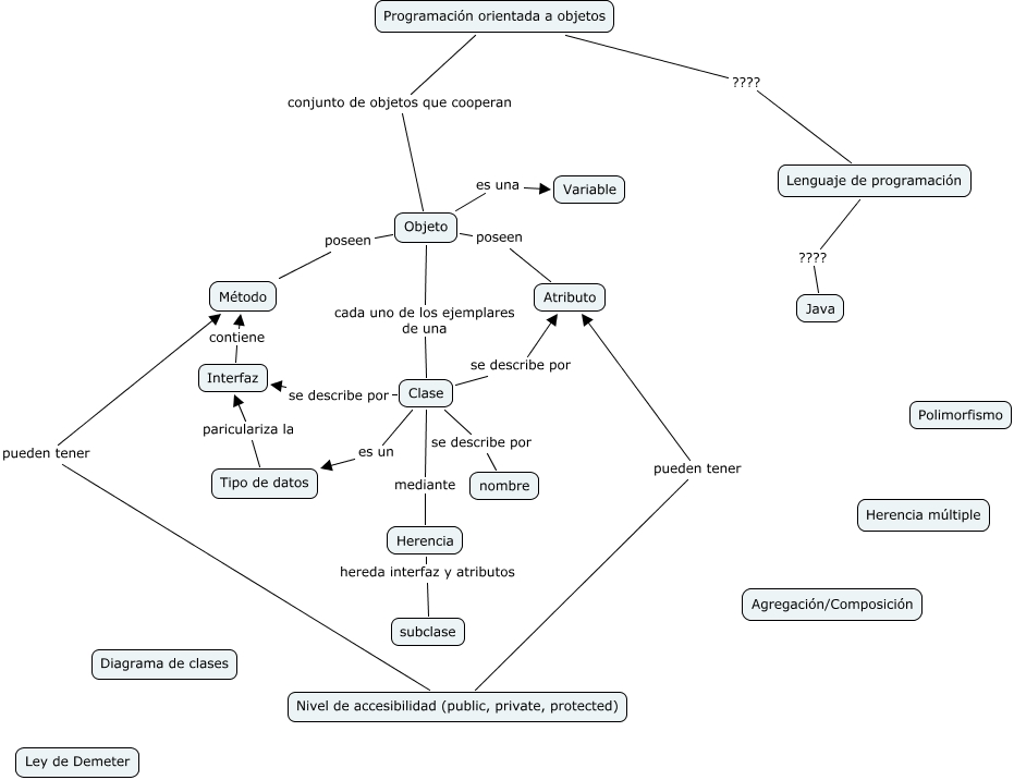 Este mapa conceptual tiene información relacionada a: Programación orientada a objetos, Tipo de datos pariculariza la Interfaz, Objeto cada uno de los ejemplares de una Clase, Clase se describe por Interfaz, Nivel de accesibilidad (public, private, protected) pueden tener Atributo, Lenguaje de programación ???? Java, Programación orientada a objetos ???? Lenguaje de programación, Objeto poseen Método, Objeto poseen Atributo, Clase mediante Herencia, Clase se describe por nombre