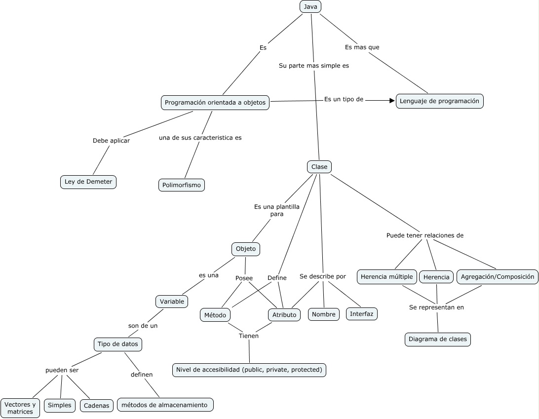 Este mapa conceptual tiene información relacionada a: Programación orientada a objetos, Variable son de un Tipo de datos, Tipo de datos pueden ser Cadenas, Objeto es una Variable, Tipo de datos pueden ser Vectores y matrices, Clase Es una plantilla para Objeto, Clase Puede tener relaciones de Agregación/Composición, Tipo de datos pueden ser Simples, Agregación/Composición Se representan en Diagrama de clases, Programación orientada a objetos Debe aplicar Ley de Demeter, Objeto Posee Método