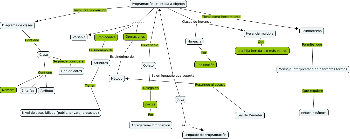 Este mapa conceptual tiene información relacionada a: Sin Título, Programación orientada a objetos Tiene como herramienta Polimorfismo, Programación orientada a objetos Contiene Operaciones, Programación orientada a objetos Clases de herencia Herencia, Programación orientada a objetos Clases de herencia Herencia múltiple, Polimorfismo Permite que Mensaje interprestado de diferentes formas, Programación orientada a objetos Es variable Objeto, partes Por Agregación/Composición, Mensaje interprestado de diferentes formas Que requiere Enlace dinámico, Clase Contiene Atributo, Operaciones Es sinónimo de Método