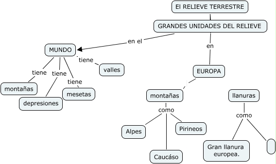 Este mapa conceptual tiene información relacionada a: Jessica 3A, montañas como Alpes, montañas como Caucáso, El RELIEVE TERRESTRE GRANDES UNIDADES DEL RELIEVE, MUNDO tiene depresiones, GRANDES UNIDADES DEL RELIEVE en EUROPA, llanuras como Gran llanura europea., MUNDO tiene valles, El RELIEVE TERRESTRE GRANDES UNIDADES DEL RELIEVE, montañas como Pirineos, MUNDO tiene montañas