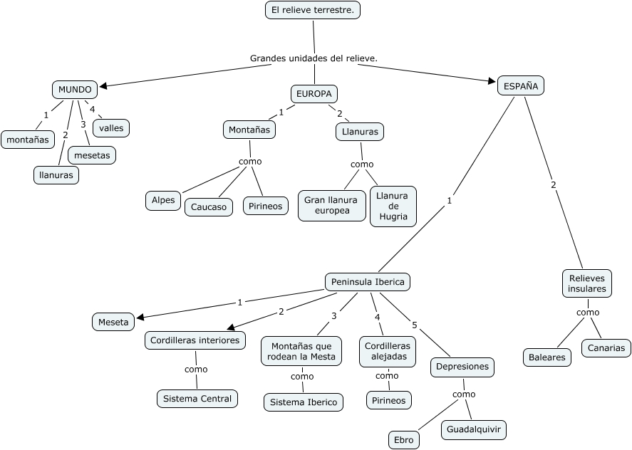 Este mapa conceptual tiene información relacionada a: ANTONIO DONCEL-MORIANO 3 A, El relieve terrestre. Grandes unidades del relieve. ESPAÑA, Llanuras como Gran llanura europea, MUNDO 1 montañas, Depresiones como Guadalquivir, Llanuras como Llanura de Hugria, Relieves insulares como Canarias, Peninsula Iberica 4 Cordilleras alejadas, Peninsula Iberica 3 Montañas que rodean la Mesta, El relieve terrestre. Grandes unidades del relieve. EUROPA, Cordilleras interiores como Sistema Central