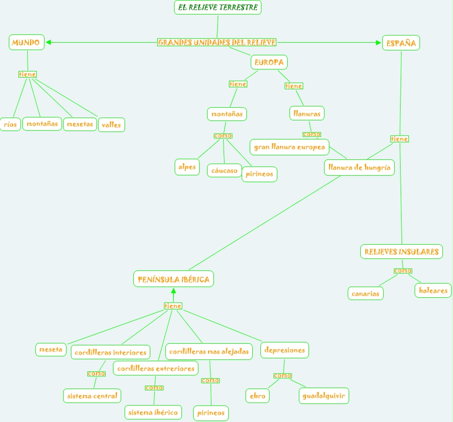 Este mapa conceptual tiene información relacionada a: ADRIAN QUINTERO 3B, PENÍNSULA IBÉRICA tiene depresiones, PENÍNSULA IBÉRICA tiene cordilleras interiores, MUNDO tiene valles, MUNDO tiene montañas, MUNDO tiene ríos, EL RELIEVE TERRESTRE GRANDES UNIDADES DEL RELIEVE EUROPA, RELIEVES INSULARES como baleares, montañas como cáucaso, depresiones como guadalquivir, PENÍNSULA IBÉRICA tiene cordilleras extreriores