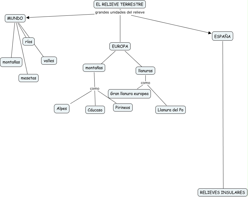 Este mapa conceptual tiene información relacionada a: Manuel Martin Reina 3ªb, EL RELIEVE TERRESTRE grandes unidades del relieve MUNDO, EL RELIEVE TERRESTRE grandes unidades del relieve ESPAÑA, MUNDO ???? ríos, MUNDO ???? montañas, ESPAÑA ???? RELIEVES INSULARES, EUROPA ???? llanuras, llanuras como Llanura del Po, montañas como Cáucaso, MUNDO ???? valles, EL RELIEVE TERRESTRE grandes unidades del relieve EUROPA