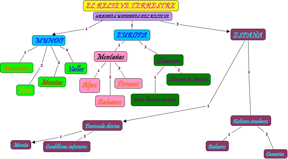 Este mapa conceptual tiene información relacionada a: marta fuentes 3ºb, Relieves insulares 1 Baleares, EUROPA 1 Montañas, Montañas 1 Alpes, MUNDO 3 Mesetas, Llanuras 1 Gran llanura europea, ESPAÑA 2 Relieves insulares, Península ibérica 2 Cordilleras inferiores, ESPAÑA 1 Península ibérica, Península ibérica 1 Meseta, MUNDO 4 Valles