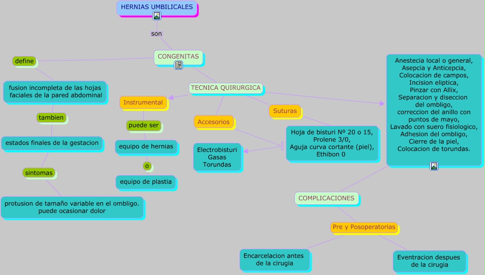 Hernias Umbilicales, CONGENITAS TECNICA QUIRURGICA Anestecia local o general, Asepcia y Anticepcia, Colocacion de campos, Incision eliptica, Pinzar con Allix, Separacion y diseccion del ombligo, correccion del anillo con puntos de mayo, Lavado con suero fisiologico, Adhesion del ombligo, Cierre de la piel, Colocacion de torundas., Accesorios Electrobisturi Gasas Torundas, Instrumental puede ser equipo de hernias, CONGENITAS TECNICA QUIRURGICA Accesorios, CONGENITAS TECNICA QUIRURGICA Suturas, Anestecia local o general, Asepcia y Anticepcia, Colocacion de campos, Incision eliptica, Pinzar con Allix, Separacion y diseccion del ombligo, correccion del anillo con puntos de mayo, Lavado con suero fisiologico, Adhesion del ombligo, Cierre de la piel, Colocacion de torundas. ???? COMPLICACIONES, equipo de hernias o equipo de plastia, COMPLICACIONES Pre y Posoperatorias Encarcelacion antes de la cirugia, COMPLICACIONES Pre y Posoperatorias Eventracion despues de la cirugia, CONGENITAS define fusion incompleta de las hojas faciales de la pared abdominal