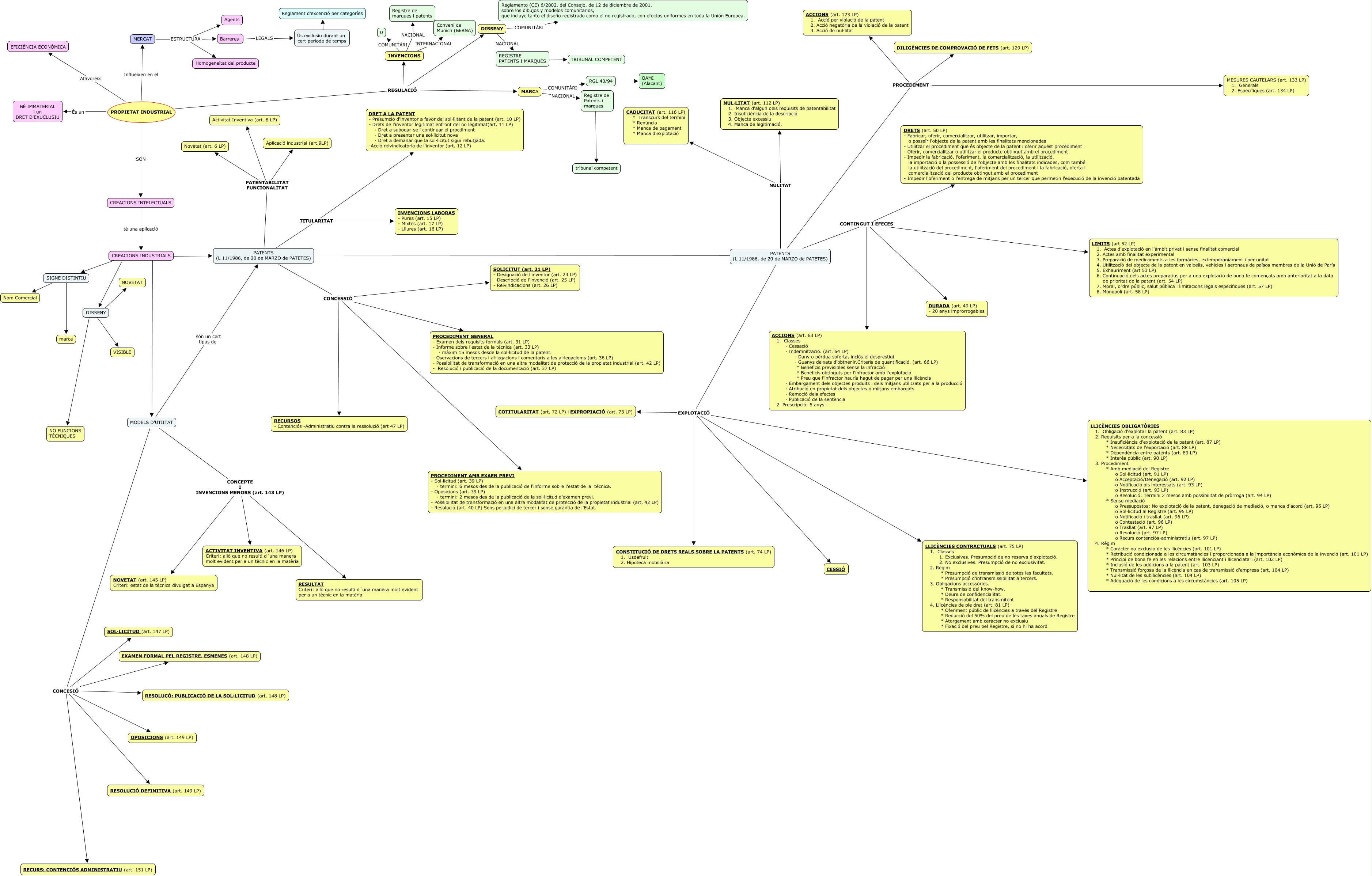 ROBAFAVES, MODELS D'UTIITAT són un cert tipus de PATENTS (L 11/1986, de 20 de MARZO de PATETES), MODELS D'UTIITAT CONCEPTE I INVENCIONS MENORS (art. 143 LP) ACTIVITAT INVENTIVA (art. 146 LP) Criteri: allò que no resulti d´una manera molt evident per a un tècnic en la matèria, PATENTS (L 11/1986, de 20 de MARZO de PATETES) CONTINGUT I EFECES ACCIONS (art. 63 LP) 1. Classes · Cessació · Indemnització. (art. 64 LP) · Dany o pèrdua soferta, inclòs el desprestigi · Guanys deixats d'obtnenir.Criteris de quantificació. (art. 66 LP) * Beneficis previsibles sense la infracció * Beneficis obtinguts per l'infractor amb l'explotació * Preu que l'infractor hauria hagut de pagar per una llicència · Embargament dels objectes produïts i dels mitjans utilitzats per a la producció · Atribució en propietat dels objectes o mitjans embargats · Remoció dels efectes · Publicació de la sentència 2. Prescripció: 5 anys., PROPIETAT INDUSTRIAL Afavoreix EFICIÈNCIA ECONÒMICA, CREACIONS INDUSTRIALS ???? MODELS D'UTIITAT, CREACIONS INDUSTRIALS són SIGNE DISTINTIU, MODELS D'UTIITAT CONCEPTE I INVENCIONS MENORS (art. 143 LP) NOVETAT (art. 145 LP) Criteri: estat de la tècnica divulgat a Espanya, PROPIETAT INDUSTRIAL REGULACIÓ INVENCIONS, DISSENY ???? VISIBLE, PATENTS (L 11/1986, de 20 de MARZO de PATETES) CONTINGUT I EFECES LIMITS (art 52 LP) 1. Actes d'explotació en l'àmbit privat i sense finalitat comercial 2. Actes amb finalitat experimental 3. Preparació de medicaments a les farmàcies, extemporàniament i per unitat 4. Utilització del objecte de la patent en vaixells, vehicles i aeronaus de països membres de la Unió de París 5. Exhauriment (art 53 LP) 6. Continuació dels actes preparatius per a una explotació de bona fe començats amb anterioritat a la data de prioritat de la patent (art. 54 LP) 7. Moral, ordre públic, salut pública i limitacions legals específiques (art. 57 LP) 8. Monopoli (art. 58 LP)