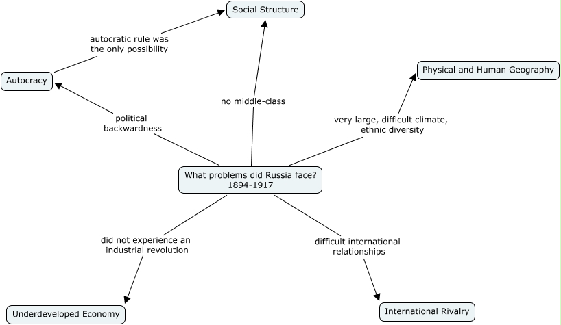 This Concept Map has information related to: ProblemsMap, Autocracy autocratic rule was the only possibility Social Structure, What problems did Russia face? 1894-1917 did not experience an industrial revolution Underdeveloped Economy, What problems did Russia face? 1894-1917 very large, difficult climate, ethnic diversity Physical and Human Geography, What problems did Russia face? 1894-1917 political backwardness Autocracy, What problems did Russia face? 1894-1917 no middle-class Social Structure, What problems did Russia face? 1894-1917 difficult international relationships International Rivalry