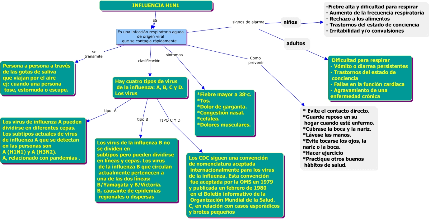 Este Cmap, tiene información relacionada con: epidemiologia, Es una infección respiratoria aguda de origen viral que se contagia rápidamente sintomas *Fiebre mayor a 38°c. *Tos. *Dolor de garganta. *Congestión nasal. *cefalea. *Dolores musculares., Es una infección respiratoria aguda de origen viral que se contagia rápidamente clasificación Hay cuatro tipos de virus de la influenza: A, B, C y D. Los virus, Es una infección respiratoria aguda de origen viral que se contagia rápidamente se transmite Persona a persona a través de las gotas de saliva que viajan por el aire ej: cuando una persona tose, estornuda o escupe., Hay cuatro tipos de virus de la influenza: A, B, C y D. Los virus tipo A Los virus de influenza A pueden dividirse en diferentes cepas. Los subtipos actuales de virus de influenza A que se detectan en las personas son A (H1N1) y A (H3N2). A, relacionado con pandemias ., niños signos de alarma Dificultad para respirar - Vómito o diarrea persistentes - Trastornos del estado de conciencia - Fallas en la función cardiaca - Agravamiento de una enfermedad crónica, Hay cuatro tipos de virus de la influenza: A, B, C y D. Los virus tipo B Los virus de la influenza B no se dividen en subtipos pero pueden dividirse en líneas y cepas. Los virus de la influenza B que circulan actualmente pertenecen a una de las dos líneas: B/Yamagata y B/Victoria. B, causante de epidemias regionales o dispersas, INFLUENCIA H1N1 ES Es una infección respiratoria aguda de origen viral que se contagia rápidamente, Es una infección respiratoria aguda de origen viral que se contagia rápidamente Como prevenir * Evite el contacto directo. *Guarde reposo en su hogar cuando esté enfermo. *Cúbrase la boca y la nariz. *Lávese las manos. *Evite tocarse los ojos, la nariz o la boca. *Hacer ejercicio *Practique otros buenos hábitos de salud., Hay cuatro tipos de virus de la influenza: A, B, C y D. Los virus TIPO C Y D Los CDC siguen una convención de nomenclatura aceptada internacionalmente para los virus de la influenza. Esta convención fue aceptada por la OMS en 1979 y publicada en febrero de 1980 en el Boletín informativo de la Organización Mundial de la Salud. C, en relación con casos esporádicos y brotes pequeños, INFLUENCIA H1N1 ES Es una infección respiratoria aguda de origen viral que se contagia rápidamente, Es una infección respiratoria aguda de origen viral que se contagia rápidamente signos de alarma Dificultad para respirar - Vómito o diarrea persistentes - Trastornos del estado de conciencia - Fallas en la función cardiaca - Agravamiento de una enfermedad crónica, niños ???? -Fiebre alta y dificultad para respirar - Aumento de la frecuencia respiratoria - Rechazo a los alimentos - Trastornos del estado de conciencia - Irritabilidad y/o convulsiones