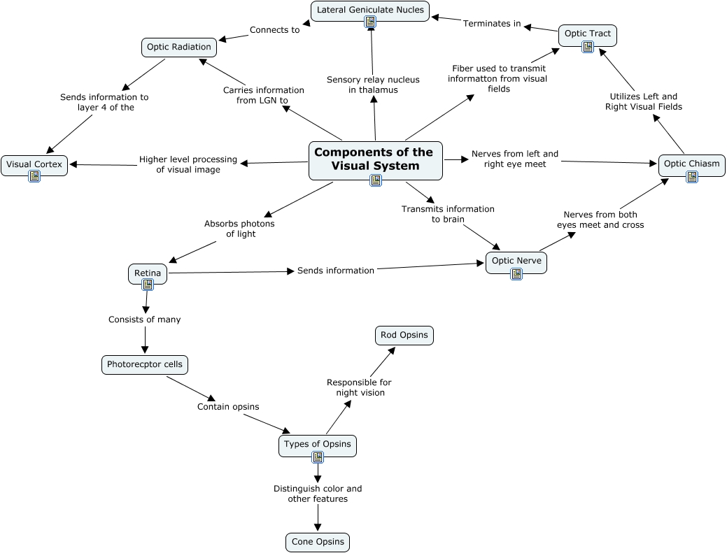 This Concept Map has information related to: Visual System, Optic Tract Terminates in Lateral Geniculate Nucles, Types of Opsins Responsible for night vision Rod Opsins, Components of the Visual System Sensory relay nucleus in thalamus Lateral Geniculate Nucles, Types of Opsins Distinguish color and other features Cone Opsins, Optic Chiasm Utilizes Left and Right Visual Fields Optic Tract, Components of the Visual System Fiber used to transmit informatton from visual fields Optic Tract, Components of the Visual System Nerves from left and right eye meet Optic Chiasm, Optic Nerve Nerves from both eyes meet and cross Optic Chiasm, Retina Sends information Optic Nerve, Components of the Visual System Carries information from LGN to Optic Radiation